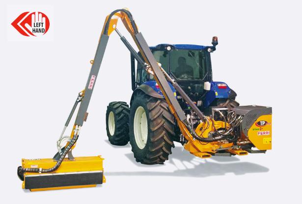 The TSF model is an ideal right/left reach mower for contractors and green maintenance operators, with large tractors and power, where the machine is fully assembled in the front area of the vehicle. The TSF600D has the frame and tank mounted on handlebars behind the tractor.